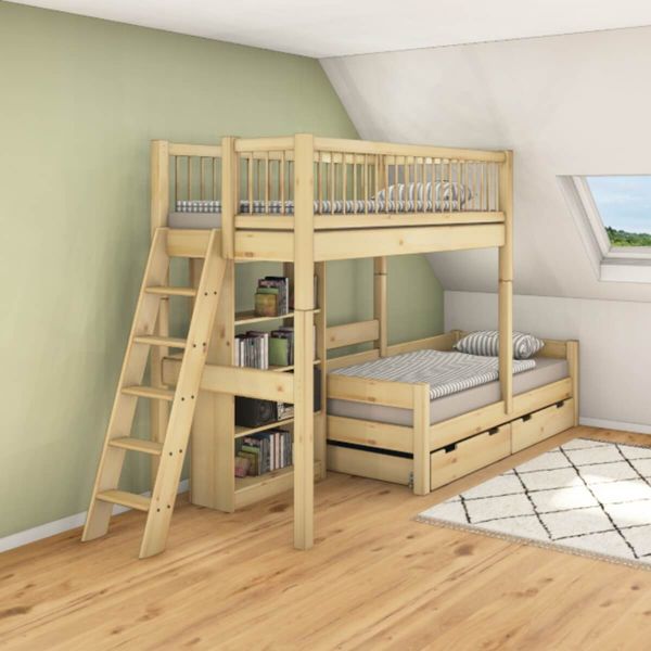 Das Etagenbett Nele - versetzt für Dachschräge - eignet sich sowohl für Kinder als auch Jugendliche und Erwachsene. Auf Grund der zeitlosen Optik ist dieses massive Bett bei allen Altersklassen sehr beliebt. Durch die Möglichkeit das obere Einzelbett sowohl nach links als auch nach rechts stufenlos auf dem unteren Einzelbett zu verschieben passt sich das Etagenbett Nele - versetzt für Dachschräge - optimal an Ihre Dachschräge und Ihren Raum an. Somit lässt sich Ihr vorhandener Raum perfekt ausnutzen.