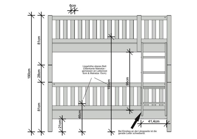 Die Absturzsicherungshöhe im oberen Bett beträgt ab Oberkante Auflageleiste ca. 55 cm. Im unteren Bett können Sie optional die Absturzsicherung vorne Noah oder die Absturzsicherung zum Aufstecken verwenden. Durch die 27mm starken Leisten und 69x69mm dicken Pfosten ist dieses Bett wirklich massiv und ist somit bis 250kg je Etage belastbar.