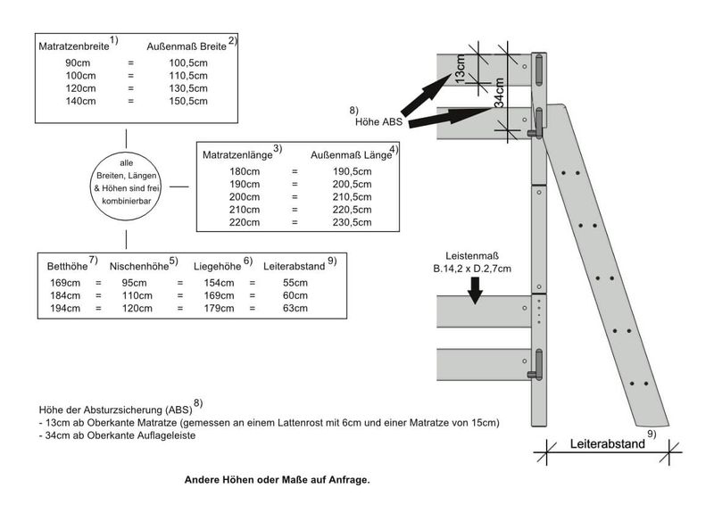 Die Absturzsicherungshöhe im oberen Bett beträgt ab Oberkante Auflageleiste ca. 34 cm. Im unteren Bett können Sie optional die Absturzsicherung vorne oder die Absturzsicherung zum Aufstecken verwenden. Mit 27mm Leistenstärke und 69x69mm dicken Pfosten ist dieses Bett wirklich massiv.
