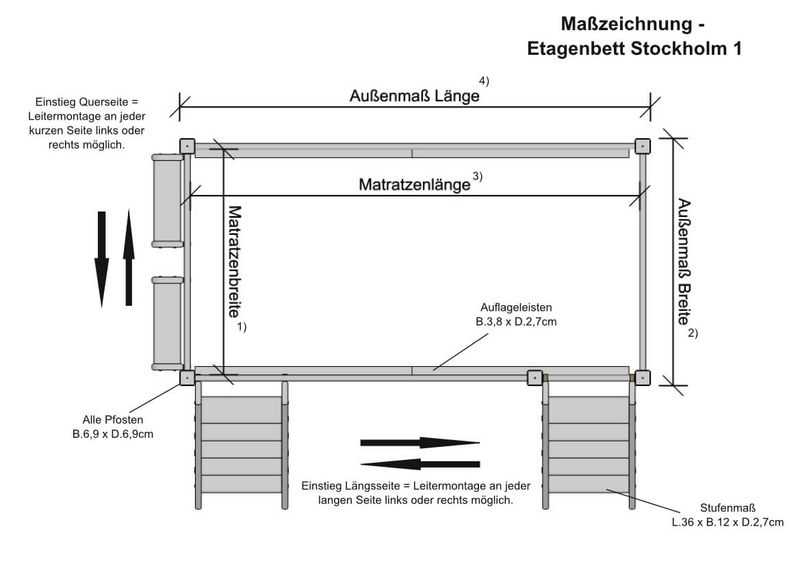 In dem Etagenbett Stockholm 1 können Sie einen Rollrost oder einen normalen Lattenrostahmen mit einer max. Länge von Matratzenlänge - 4 cm einlegen.