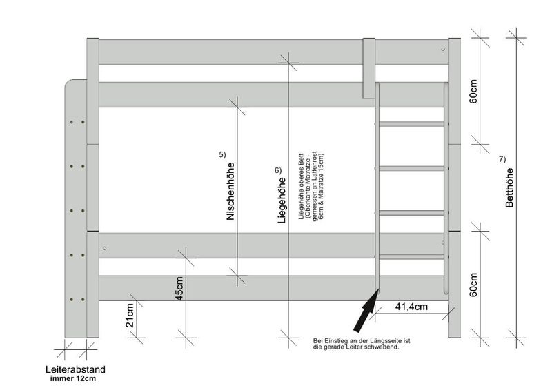 Die Absturzsicherungshöhe im oberen Bett beträgt ab Oberkante Auflageleiste ca. 34 cm. Im unteren Bett können Sie optional die Absturzsicherung vorne oder die Absturzsicherung zum Aufstecken verwenden. Mit 27mm Leistenstärke und 69x69mm dicken Pfosten ist dieses Bett wirklich massiv.