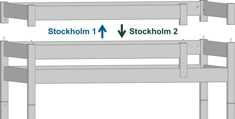 Das Etagenbett Stockholm 1 kann ohne weiteres Zubehör zu zwei bodentiefen Einzelbetten zurück gebaut werden. Ein Umbau zu einem Hochbett oder einer anderen Einstiegsseite ist mit unseren Umbausätzen stets möglich.