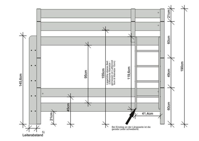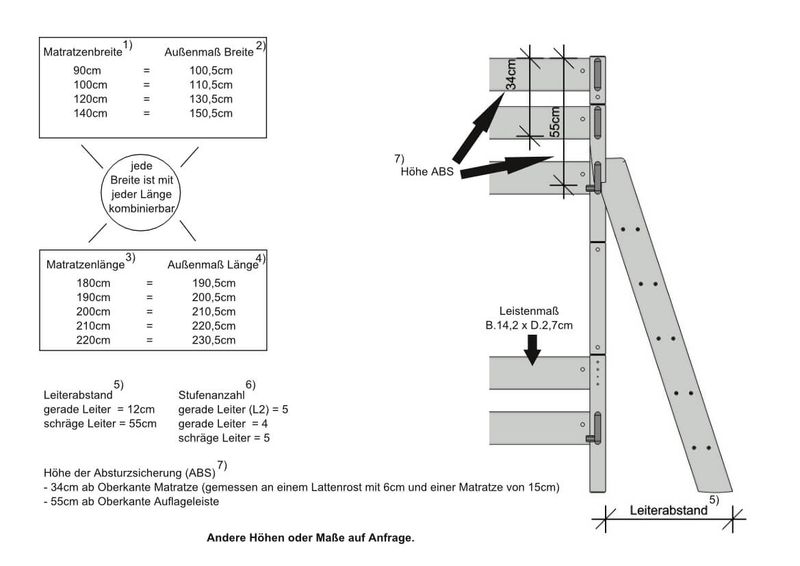 Sofern Sie eine individuelle Sonderhöhe Ihres Etagenbettes wünschen wählen Sie im Auswahlfenster Gesamthöhe bitte "Sonderhöhe" aus und notieren Ihre Wunschhöhe im Kundenwunschfeld an der Kasse. Hierbei verändert sich der Abstand zwischen dem oberen und unteren Bett. Die Leiterlänge passen wir ebenfalls automatisch an.