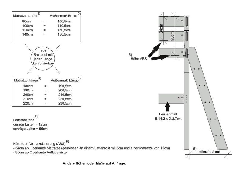 Durch die zusätzliche Rundumsicherung beträgt die Absturzsicherungshöhe im oberen Bett beträgt ab Oberkante Auflageleiste ca. 55 cm. Im unteren Bett können Sie optional die Absturzsicherung vorne oder die Absturzsicherung zum Aufstecken verwenden. Durch die 27mm starken Leisten und 69x69mm dicken Pfosten ist dieses Bett wirklich massiv und ist somit bis 250kg je Etage belastbar.