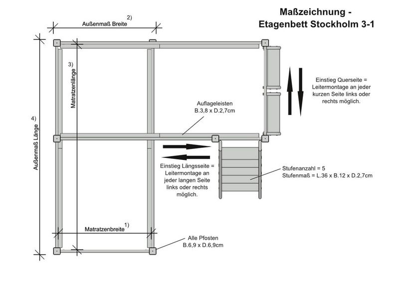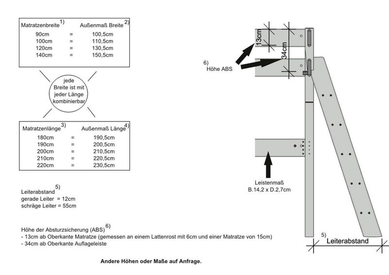 Die Absturzsicherungshöhe im oberen Bett beträgt ab Oberkante Auflageleiste ca. 34 cm. Im unteren Bett können Sie optional die Absturzsicherung vorne oder die Absturzsicherung zum Aufstecken verwenden. Durch die 27mm starken Leisten und 69x69mm dicken Pfosten ist dieses Bett wirklich massiv und ist somit bis 250kg je Etage belastbar.