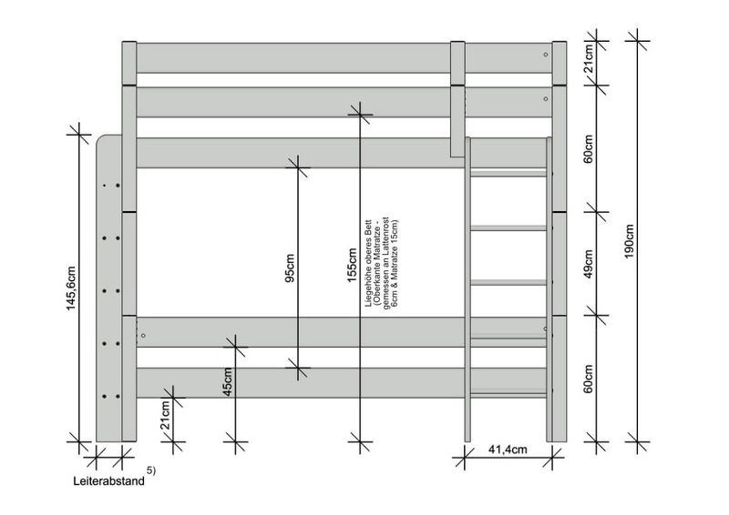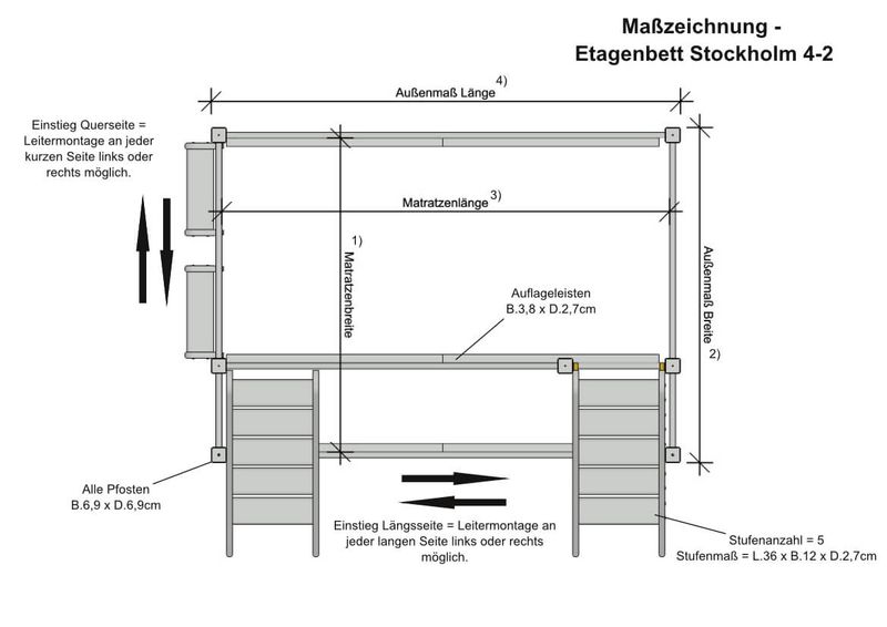 Die Absturzsicherungshöhe im oberen Bett beträgt ab Oberkante Auflageleiste ca. 55 cm. Im unteren Bett können Sie optional die Absturzsicherung vorne oder die Absturzsicherung zum Aufstecken verwenden. Durch die 27mm starken Leisten und 69x69mm dicken Pfosten ist dieses Bett wirklich massiv und ist somit bis 250kg je Etage belastbar.