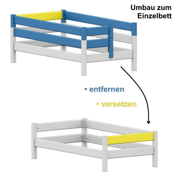 Das Etagenbett Stockholm 4-2 kann ohne weiteres Zubehör zu zwei bodentiefen Einzelbetten zurück gebaut werden. Ein Umbau zu einem Hochbett oder einer anderen Einstiegsseite ist mit unseren Umbausätzen stets möglich.