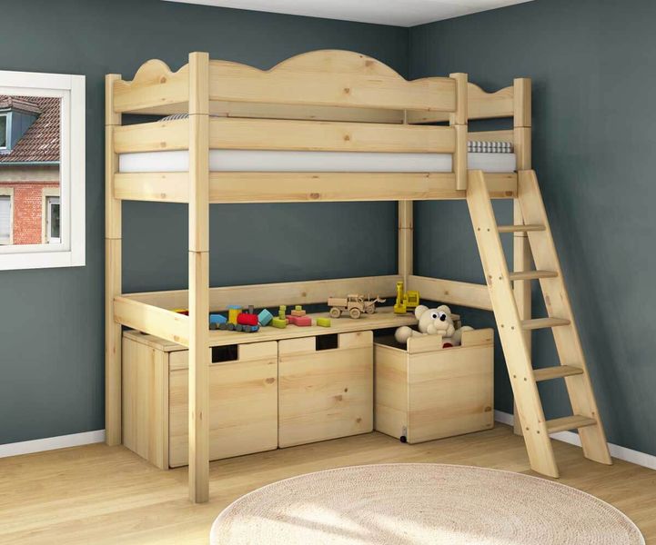Hochbett Benni - massive Kiefer in vielen Farben, Größen und Leiter an Längs- und Querseite