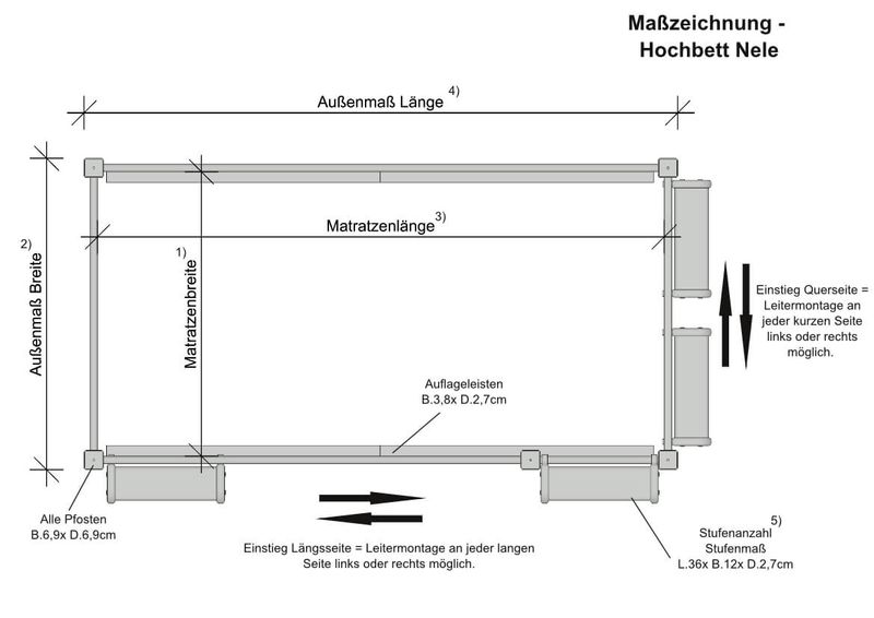 In dem Hochbett Nele können Sie einen Rollrost oder einen normalen Lattenrostahmen mit einer max. Länge von Matratzenlänge - 4 cm einlegen.