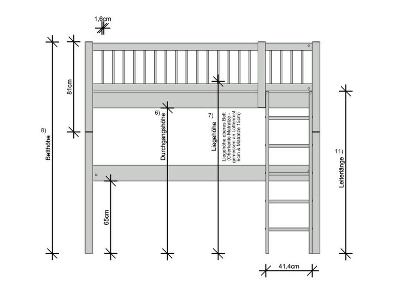 Auf Grund der hohen Rundumsicherung bietet das Hochbett Nele ca. 55cm Absturzsicherungshöhe ab Oberkante Auflageleiste. Mit 27mm Leistenstärke und 69x69mm dicken Pfosten ist dieses Bett wirklich massiv.