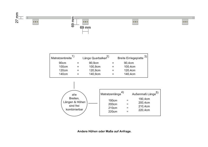 | Bettlänge (Auswahl) | 190cm, 200cm, 210cm, 220cm |