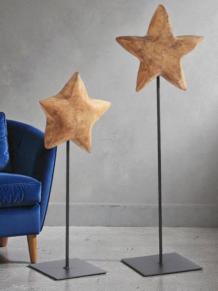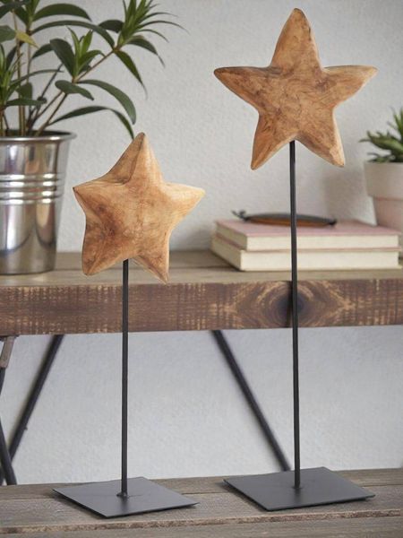 Holzstern aus Teak auf schwarz-braunem Metallfuß in verschiedenen Höhen