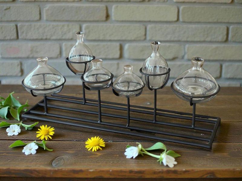 Mit Blumen dekoriert wirkt das aus Eisen gefertigte Gestell mit seinen schlichten Gläsern elegant und zeitlos.