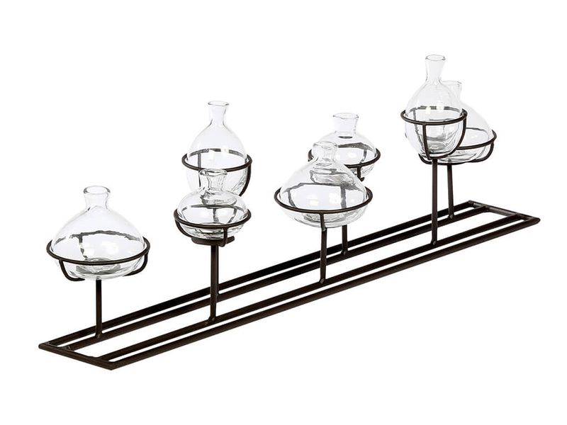 Mit Blumen dekoriert wirkt das aus Eisen gefertigte Gestell mit seinen schlichten Gläsern elegant und zeitlos.