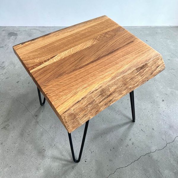 Beistelltisch / Couchtisch Eiche geölt mit Baumkante und schwarzen Pinfüßen - Maße: L. 40 x B. 32 x H. 45 cm