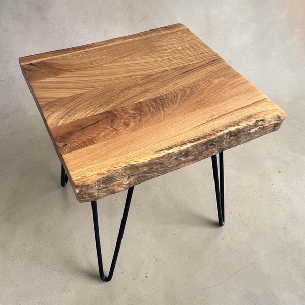 Beistelltisch / Couchtisch Eiche geölt mit Baumkante und schwarzen Pinfüßen - Maße: L. 40 x B. 36 x H. 44,5 cm