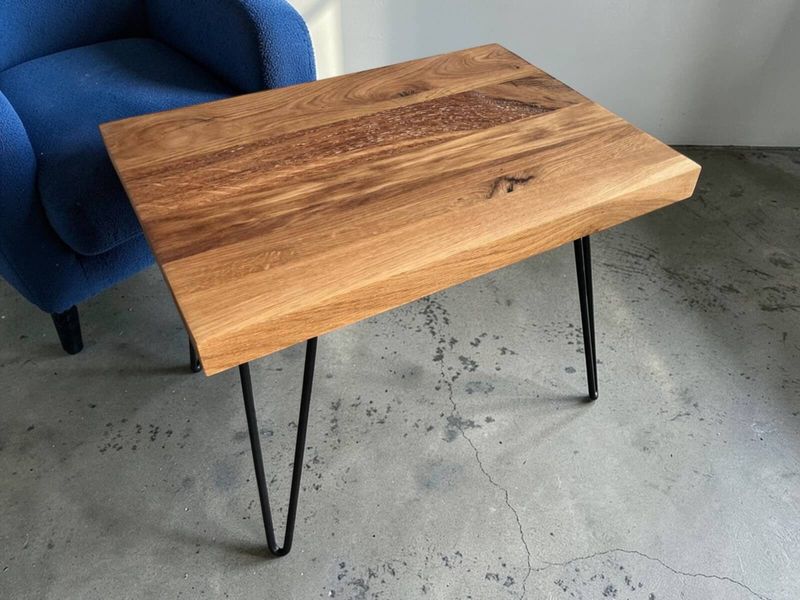 Die schlichte gerade Tischkante ist angenehm weich gerundet. Evtl. Astlöcher sind mit schwarzem Holzkitt gefüllt, geschliffen und mit einen Hartwachsöl behandelt.
