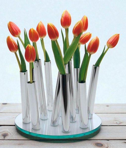Bouquet Vase von Philippi - Höhe 17 cm - Aluminium hochglanzpolierte Minivasen auf einer Glasplatte