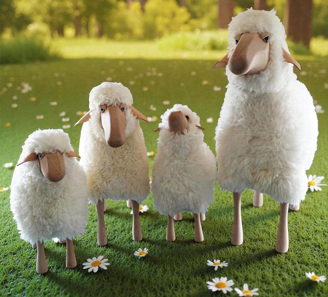 Die von Hanns-Peter Krafft entworfenen lebensechten Tiernachbildungen machen mächtig was her und beeindrucken vor allem durch Ihre täuschend echte Optik und Haptik. Der Kopf und die Beine bestehen aus echtem Buchenholz, der Körper, hergestellt aus einer Konstruktion gefüllt mit Holzspäne und überzogen mit Jute. Darüber wird in aufwändiger Handarbeit das echte flauschige Schafsfell angebracht. Die Ohren werden aus Leder hergestellt. Abgesehen von Ihrer dekorativen Funktion ist es sogar möglich auf diesen Schafen zu sitzen. Optimal für Photographen, Ladengeschäfte oder Geschenkidee.