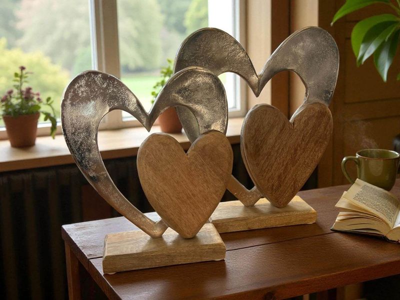 Der dekorative Herzaufsteller aus Aluminium und Mangoholz ist perfekt um eine romantische Stimmung zu verbreiten.