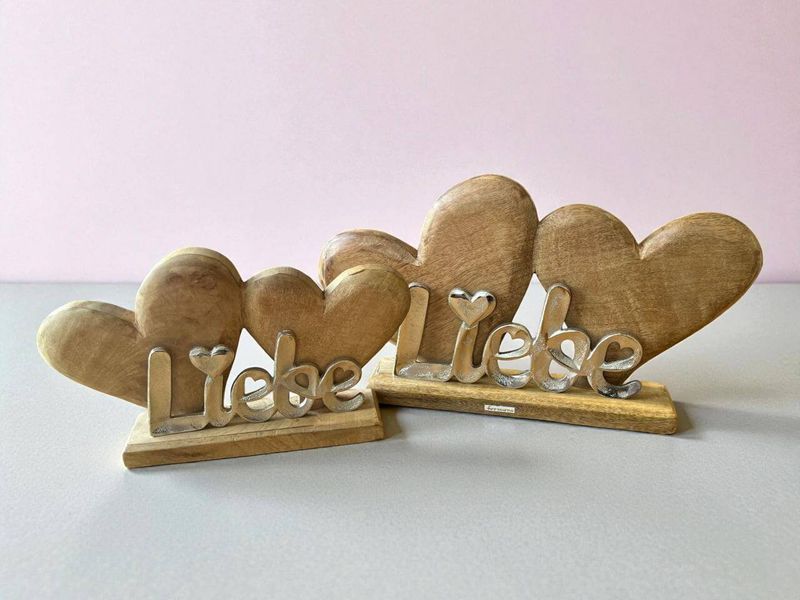 Lieferumfang: Ein Herzaufsteller mit zwei Holzherzen und einem Schriftzug "Liebe" je VE.