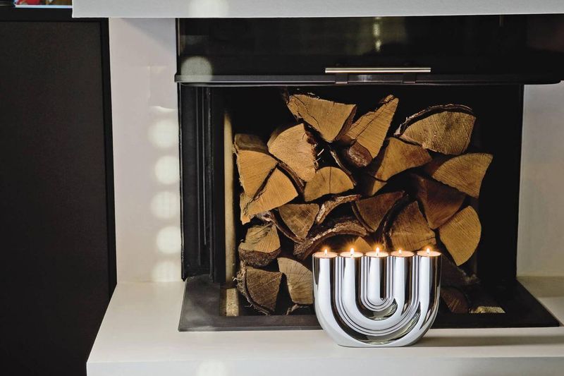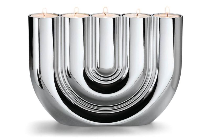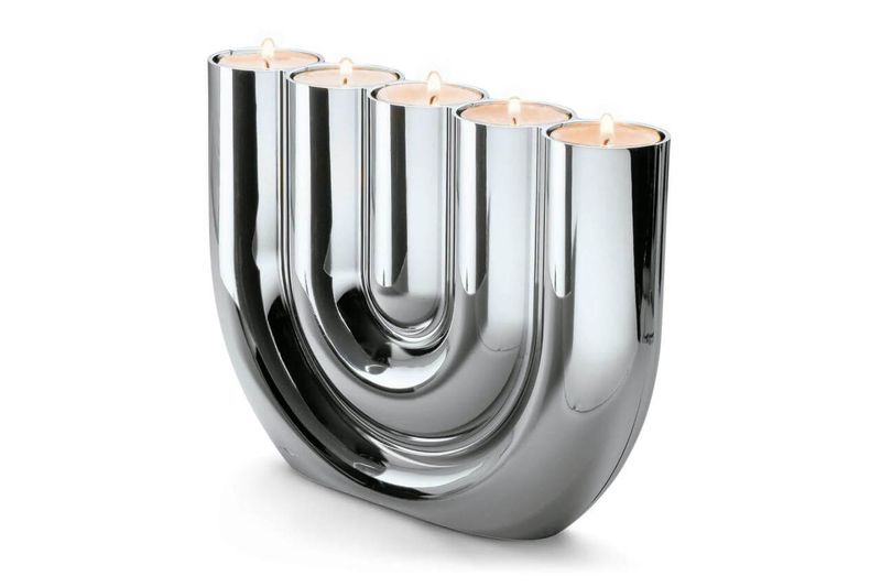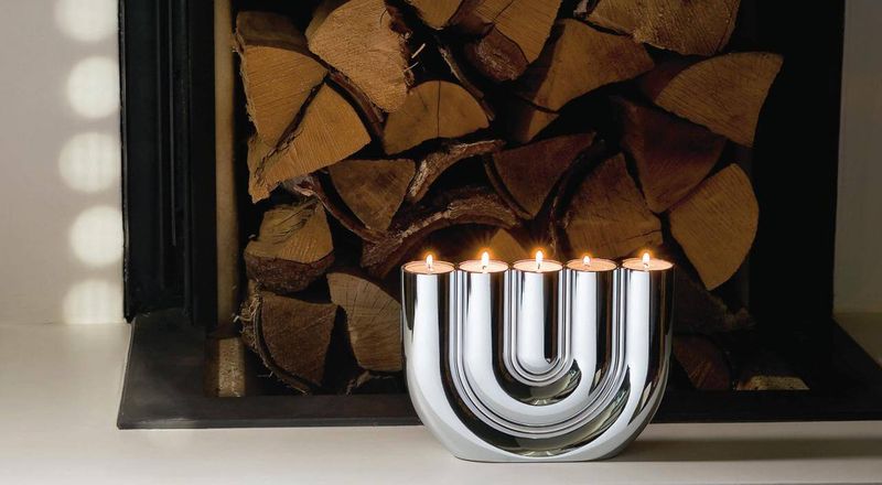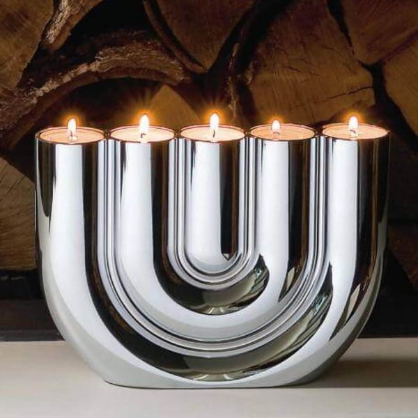 Der Double U Teelichthalter bietet mit seiner geschwungenen U-Form platz für fünf Teelichter. Durch seine hochglanzpolierte Chromoptik wirkt er sehr edel und lässt sich frei auf Tischen, Sideboards oder Tresen präsentieren.
