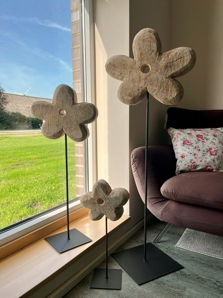 Für die nötige Standsicherheit der massiven Holzblumen sorgt der stabile Metallfuß - durch seine natürliche Machart ist jede Blume ein Unikat.