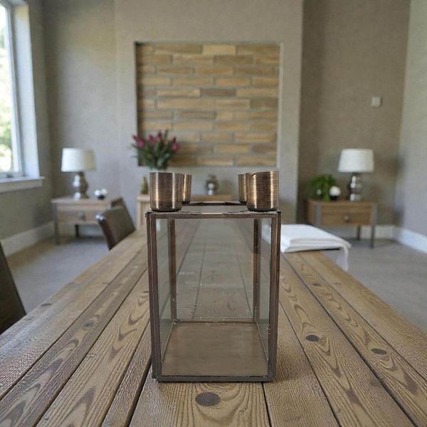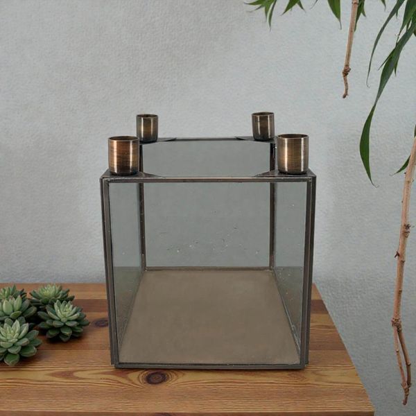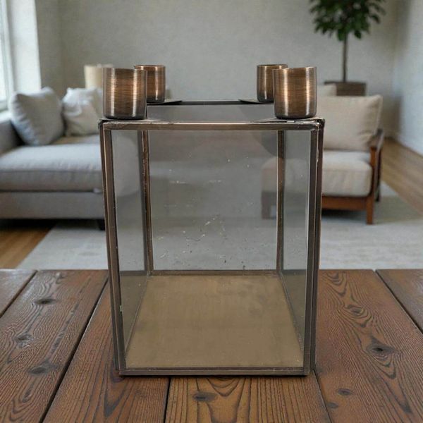 Dieser wunderschöne goldene Dekoartikel vereint Laterne und Kerzenhalter. Oben fasst der Kerzenhalter vier Stabkerzen von 22cm Durchmesser. Unten können weitere Stumpenkerzen oder dekrorative Elemente untergebracht werden. Egal ob im Eingangsbereich, auf der Fensterbank oder im Wintergarten.